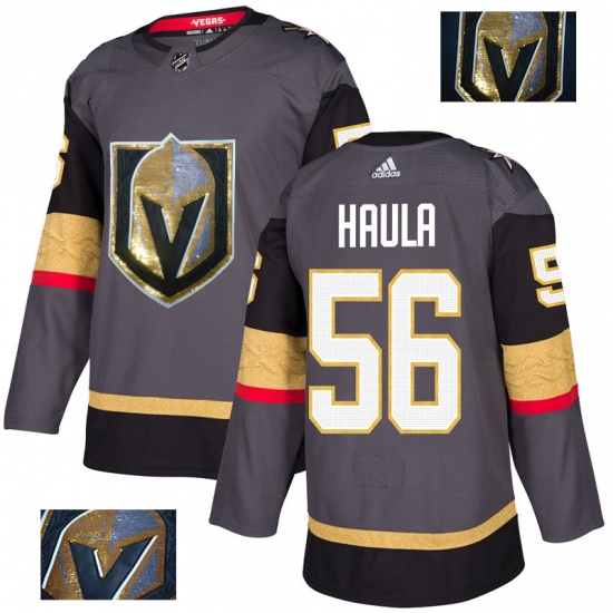 >Men's Adidas Vegas Golden Knights #56 Erik Haula Authentic Gray Fashion Gold NHL Jersey