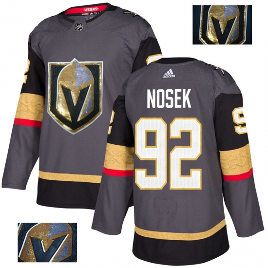 >Men's Adidas Vegas Golden Knights #92 Tomas Nosek Authentic Gray Fashion Gold NHL Jersey