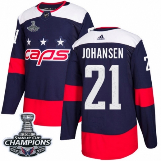 >Men's Adidas Washington Capitals #21 Lucas Johansen Authentic Navy Blue 2018 Stadium Series 2018 Stanley Cup Final Champions NHL Jersey