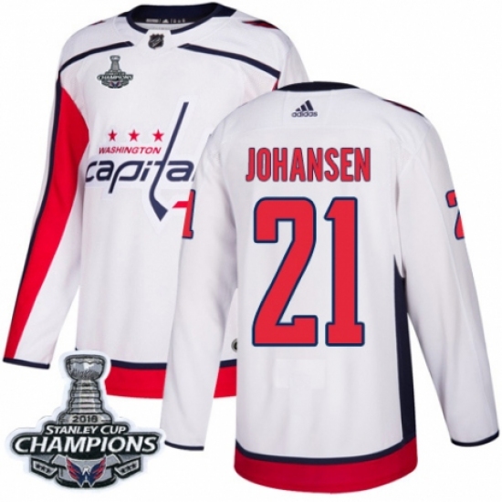 Men's Adidas Washington Capitals #21 Lucas Johansen Authentic White Away 2018 Stanley Cup Final Champions NHL Jersey