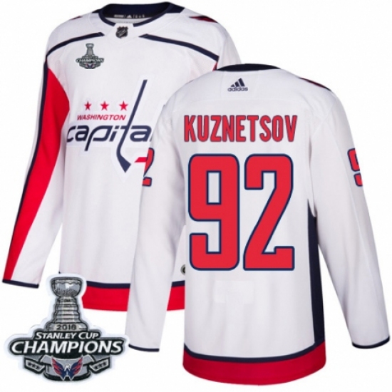 Men's Adidas Washington Capitals #92 Evgeny Kuznetsov Authentic White Away 2018 Stanley Cup Final Champions NHL Jersey