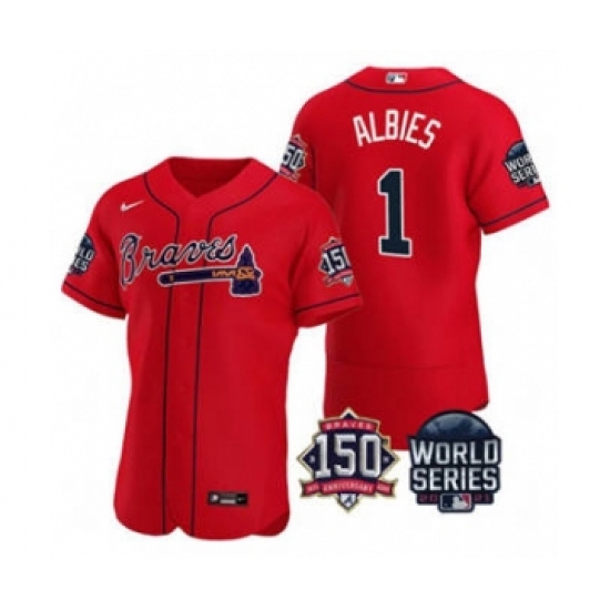 Men's Atlanta Braves #1 Ozzie Albies 2021 Red World Series Flex Base With 150th Anniversary Patch Baseball Jersey