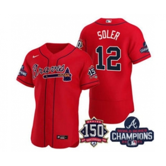 Men's Atlanta Braves #12 Jorge Soler 2021 Red World Series Champions With 150th Anniversary Flex Base Stitched Jersey