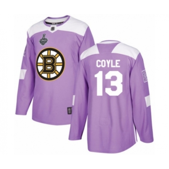 >Men's Boston Bruins #13 Charlie Coyle Authentic Purple Fights Cancer Practice 2019 Stanley Cup Final Bound Hockey Jersey