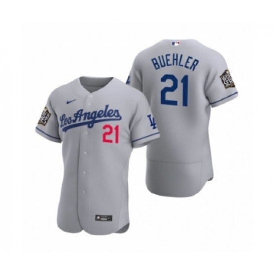 >Men's Los Angeles Dodgers #21 Walker Buehler Nike Gray 2020 World Series Authentic Road Jersey