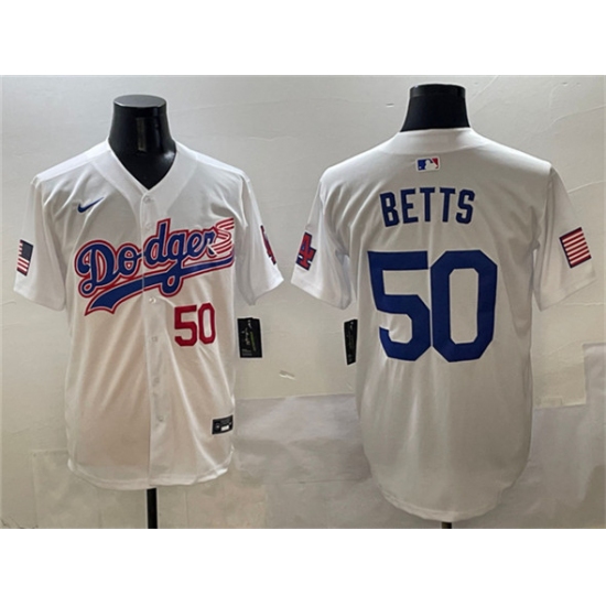 >Men's Los Angeles Dodgers #50 Mookie Betts White With American Flag Limited Stitched Baseball Jersey