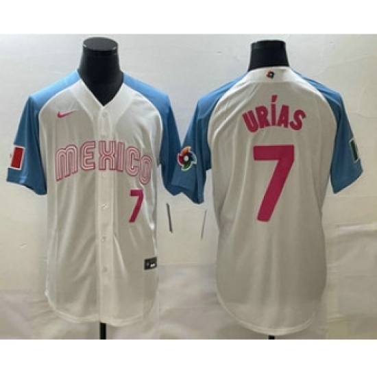 >Men's Mexico Baseball #7 Julio Urias Number 2023 White Blue World Classic Stitched Jersey