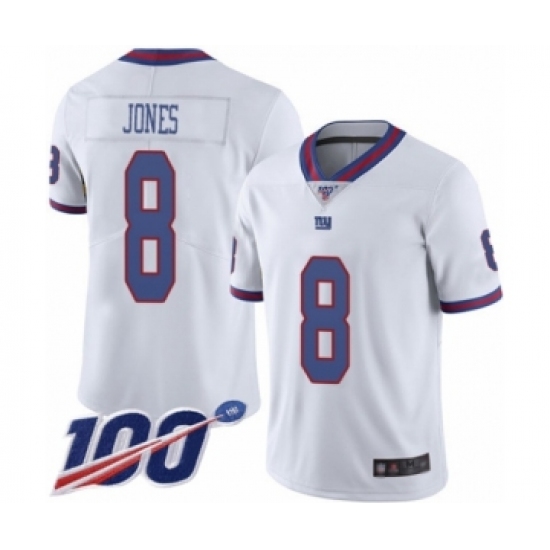 >Men's New York Giants #8 Daniel Jones Limited White Rush Vapor Untouchable 100th Season Football Jersey