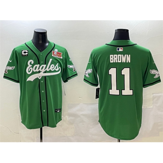 Men's Philadelphia Eagles #11 A.J. Brown Green 2025 Super Bowl LIX And 3-Star C Stitched Baseball Jersey