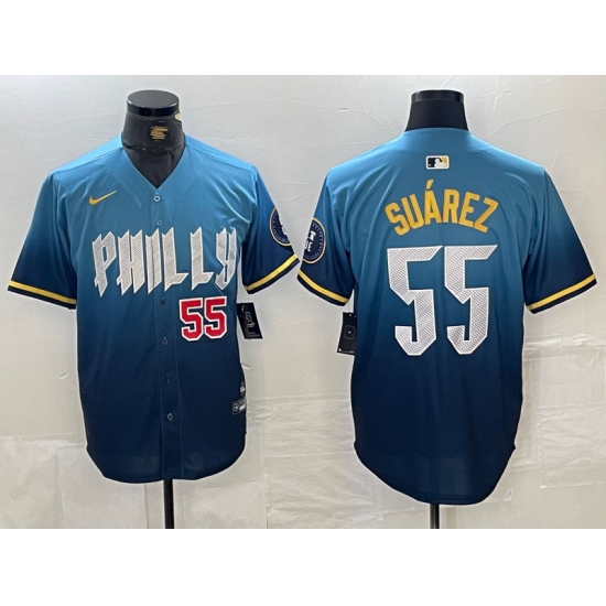 Men's Philadelphia Phillies #55 Ranger Suarez Blue 2024 City Player Number Cool Base Jerseys