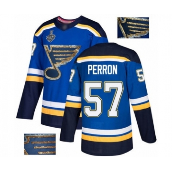 >Men's St. Louis Blues #57 David Perron Authentic Royal Blue Fashion Gold 2019 Stanley Cup Final Bound Hockey Jersey