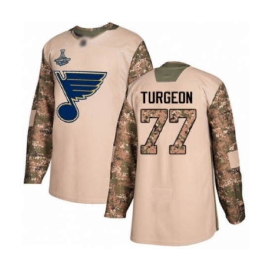 >Men's St. Louis Blues #77 Pierre Turgeon Authentic Camo Veterans Day Practice 2019 Stanley Cup Champions Hockey Jersey