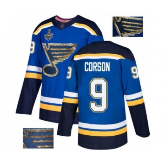 >Men's St. Louis Blues #9 Shayne Corson Authentic Royal Blue Fashion Gold 2019 Stanley Cup Final Bound Hockey Jersey