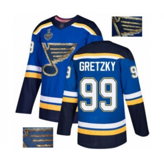 >Men's St. Louis Blues #99 Wayne Gretzky Authentic Royal Blue Fashion Gold 2019 Stanley Cup Final Bound Hockey Jersey