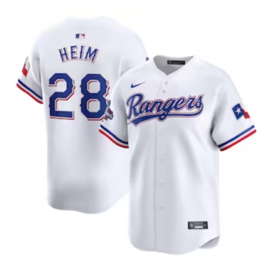 >Men's Texas Rangers #28 Jonah Heim Nike White Home 2023 World Series Champions Limited Jersey