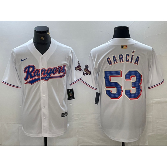 >Men's Texas Rangers #53 Adolis Garcia White 2023 World Series Champions Cool Base Jersey