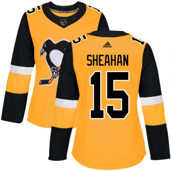 >Women's Adidas Pittsburgh Penguins #15 Riley Sheahan Authentic Gold Alternate NHL Jersey