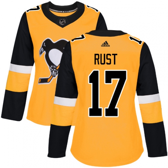 >Women's Adidas Pittsburgh Penguins #17 Bryan Rust Authentic Gold Alternate NHL Jersey