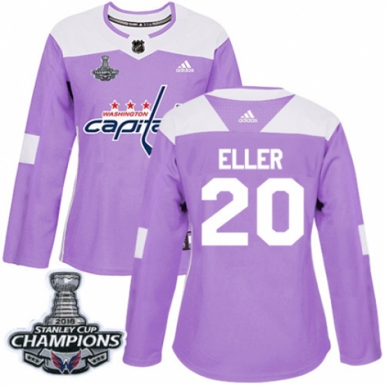 >Women's Adidas Washington Capitals #20 Lars Eller Authentic Purple Fights Cancer Practice 2018 Stanley Cup Final Champions NHL Jersey
