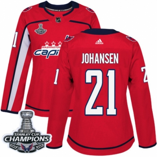 Women's Adidas Washington Capitals #21 Lucas Johansen Authentic Red Home 2018 Stanley Cup Final Champions NHL Jersey