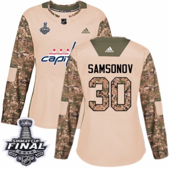 >Women's Adidas Washington Capitals #30 Ilya Samsonov Authentic Camo Veterans Day Practice 2018 Stanley Cup Final NHL Jersey