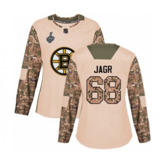 Women's Boston Bruins #68 Jaromir Jagr Authentic Camo Veterans Day Practice 2019 Stanley Cup Final Bound Hockey Jersey