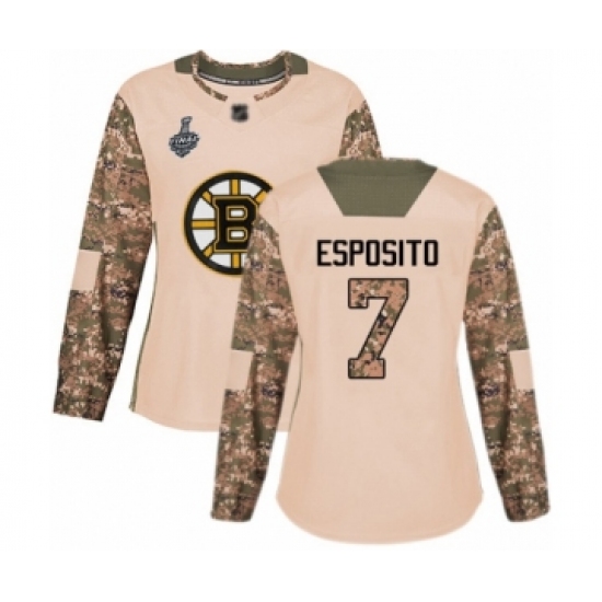 Women's Boston Bruins #7 Phil Esposito Authentic Camo Veterans Day Practice 2019 Stanley Cup Final Bound Hockey Jersey