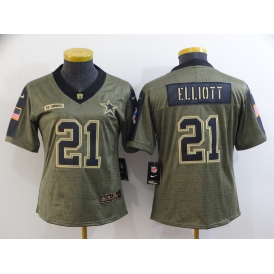 >Women's Dallas Cowboys #21 Ezekiel Elliott Gold 2021 Salute To Service Limited Player Jersey