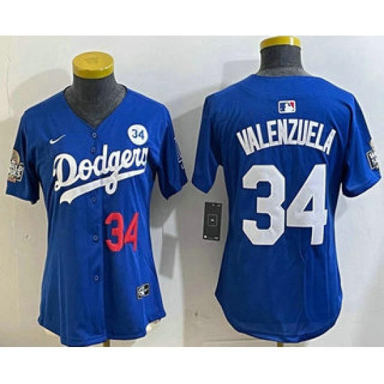 >Women's Los Angeles Dodgers #34 Fernando Valenzuela Number Blue 2024 World Series With Fernando 34 Limited Stitched Jersey