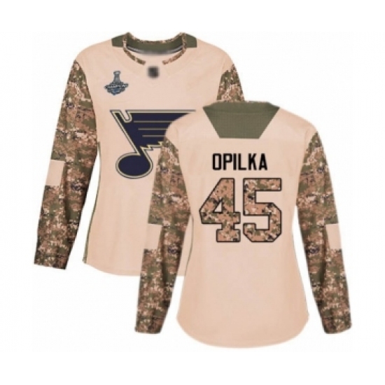 >Women's St. Louis Blues #45 Luke Opilka Authentic Camo Veterans Day Practice 2019 Stanley Cup Champions Hockey Jersey