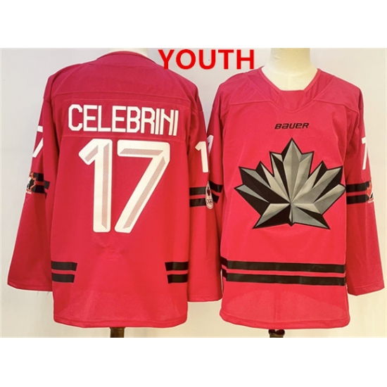 >Youth Canada Hockey #17 Macklin Celebrini Red 2026 Olympics Stitched Jersey