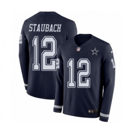 >Youth Nike Dallas Cowboys #12 Roger Staubach Limited Navy Blue Therma Long Sleeve NFL Jersey